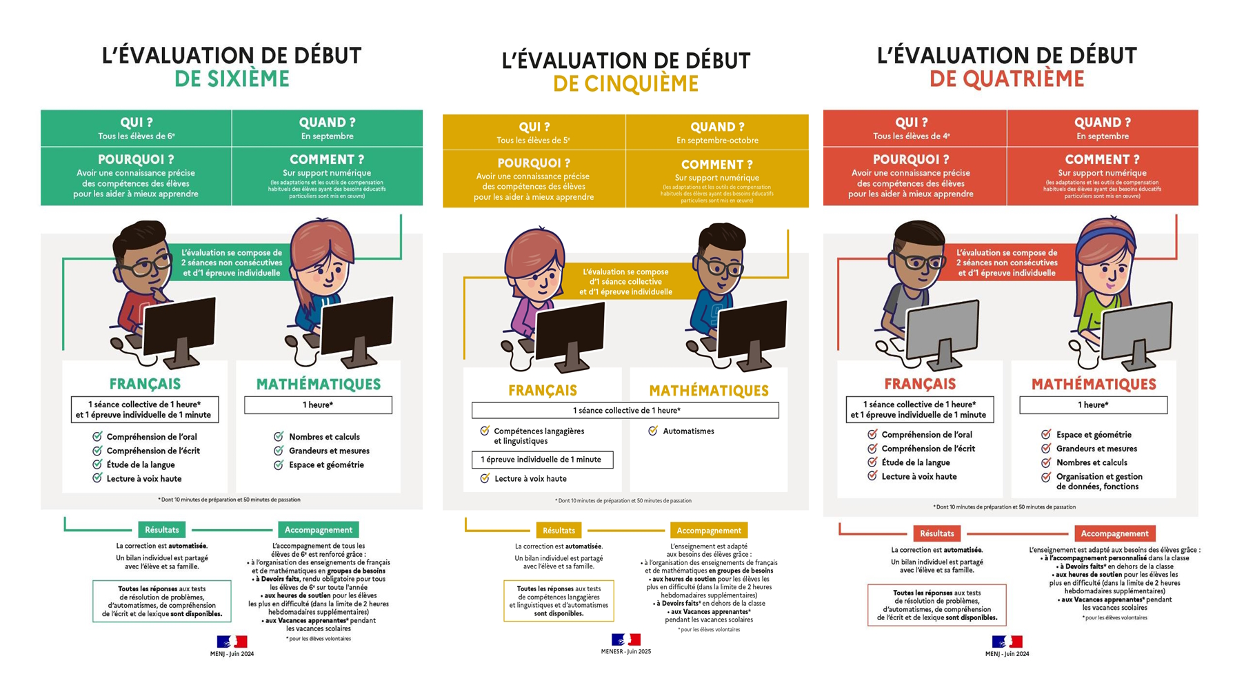 Les élèves de sixième, cinquième et de quatrième passeront des évaluations nationales en français, fluence et mathématiques en septembre 2025 au collège. Les résultats seront exploités par les enseignants de ces disciplines pour répondre aux besoins des élèves.